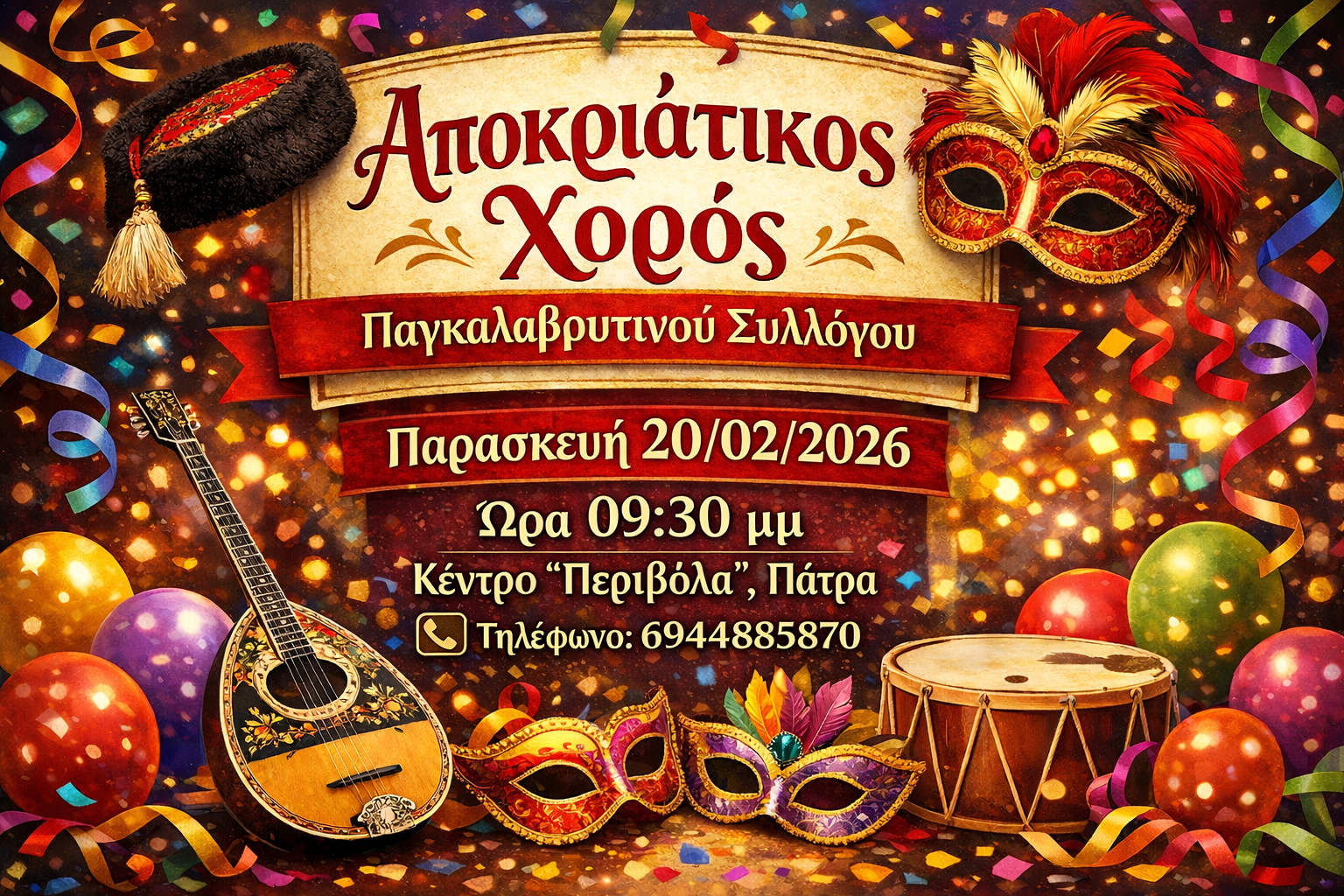 Ο Παγκαλαβρυτινός Σύλλογος σας προσκαλεί στον ετήσιο Αποκριάτικο Χορό του, μια ξεχωριστή βραδιά αφιερωμένη στη χαρά, τη συνάντηση και τη διασκέδαση, στο πλαίσιο των αποκριάτικων εκδηλώσεων.